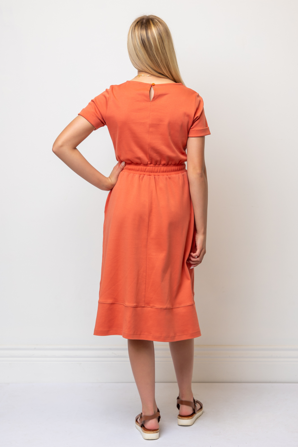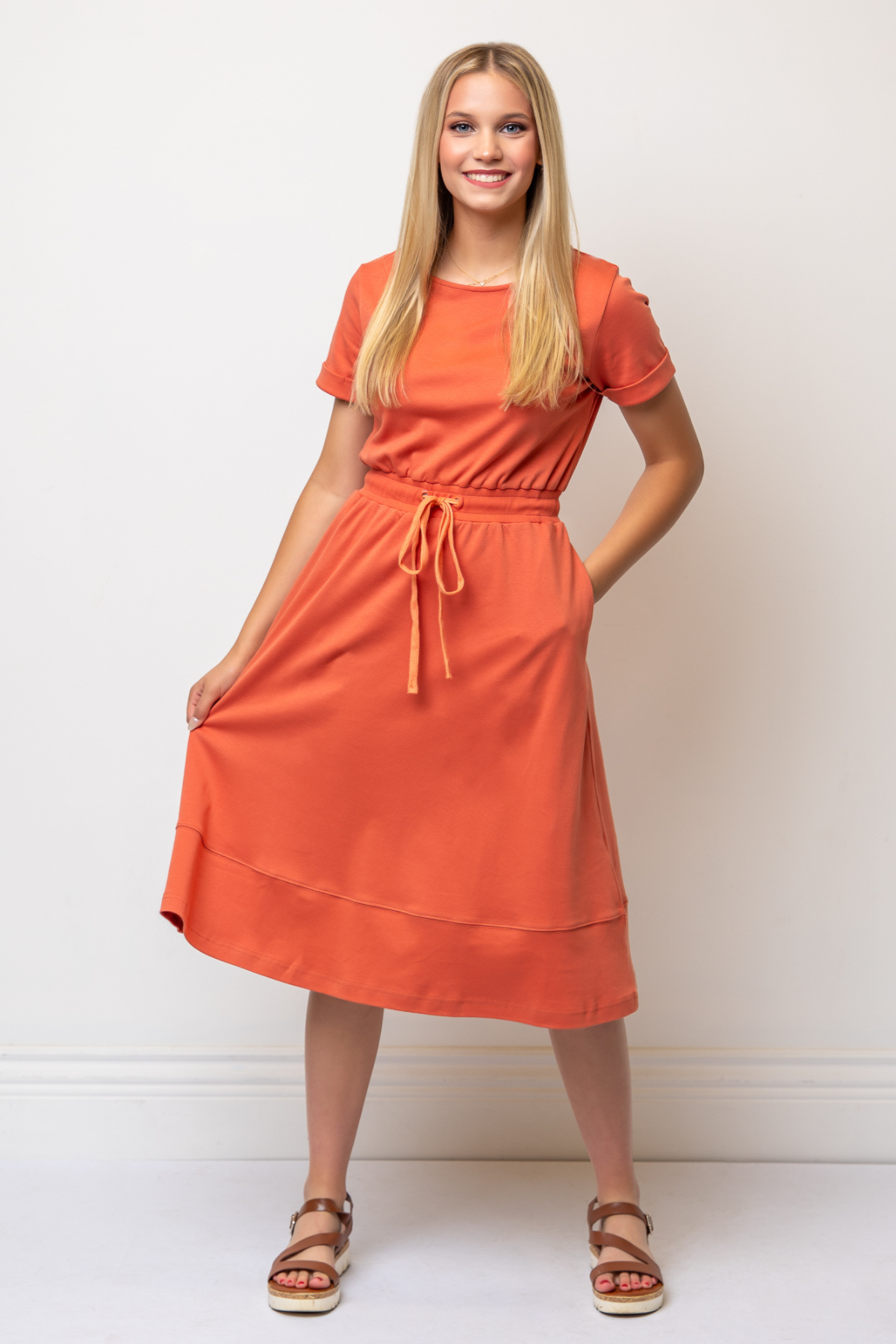 The Marie Dress will be a favorite with its versatile design and timeless silhouette. Crafted with a classic soft ponte knit, this dress offers both style and comfort in one package. Its feminine yet sporty silhouette features a boat neckline, cuffed short sleeves, and a stretch waist with a functioning drawstring, making it ideal for those on-the-go days.