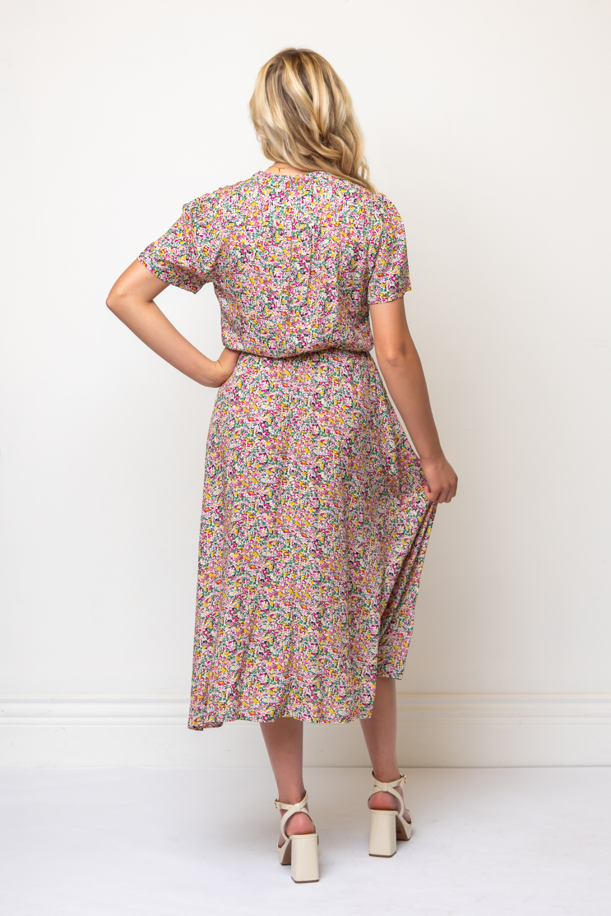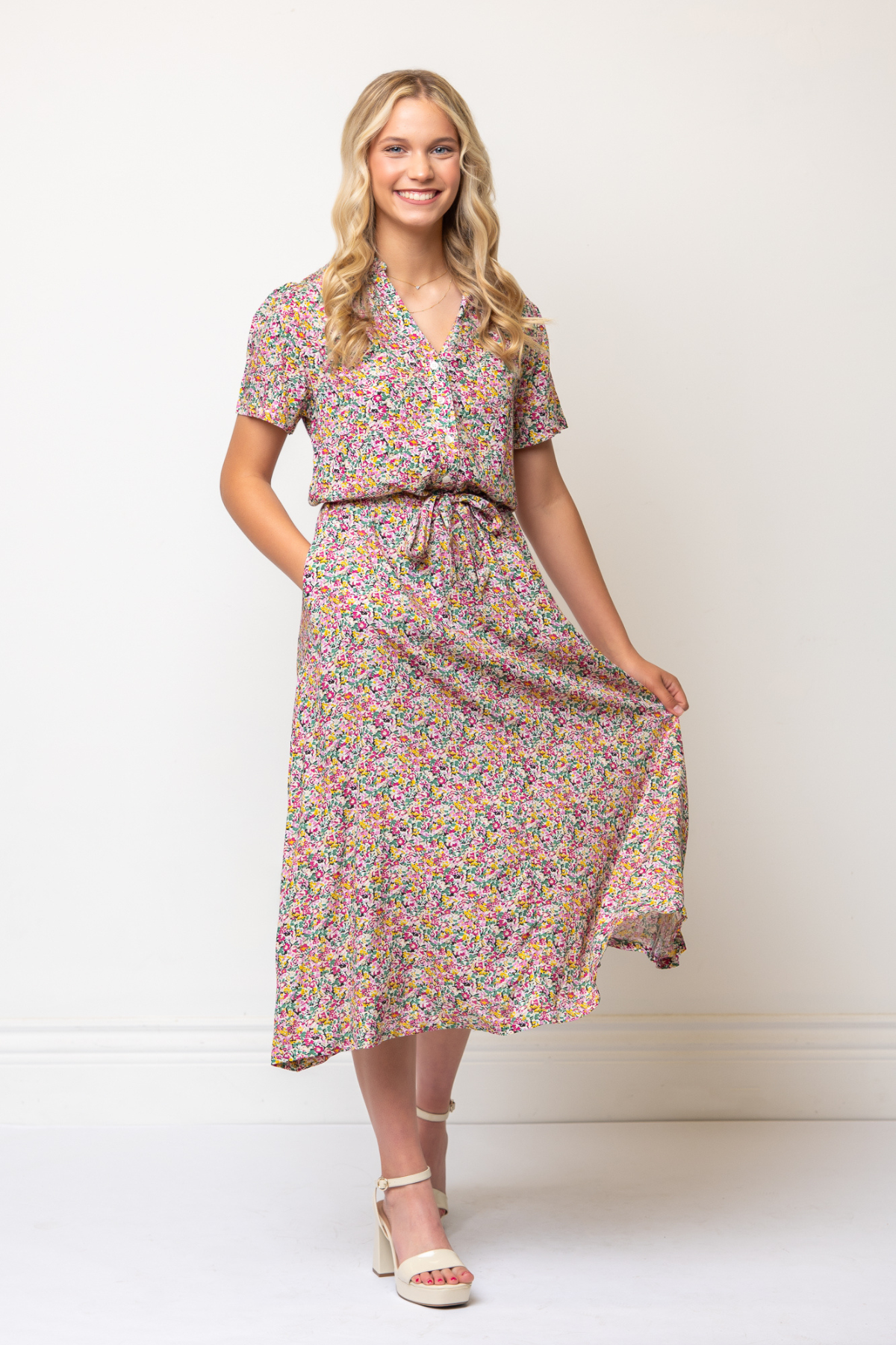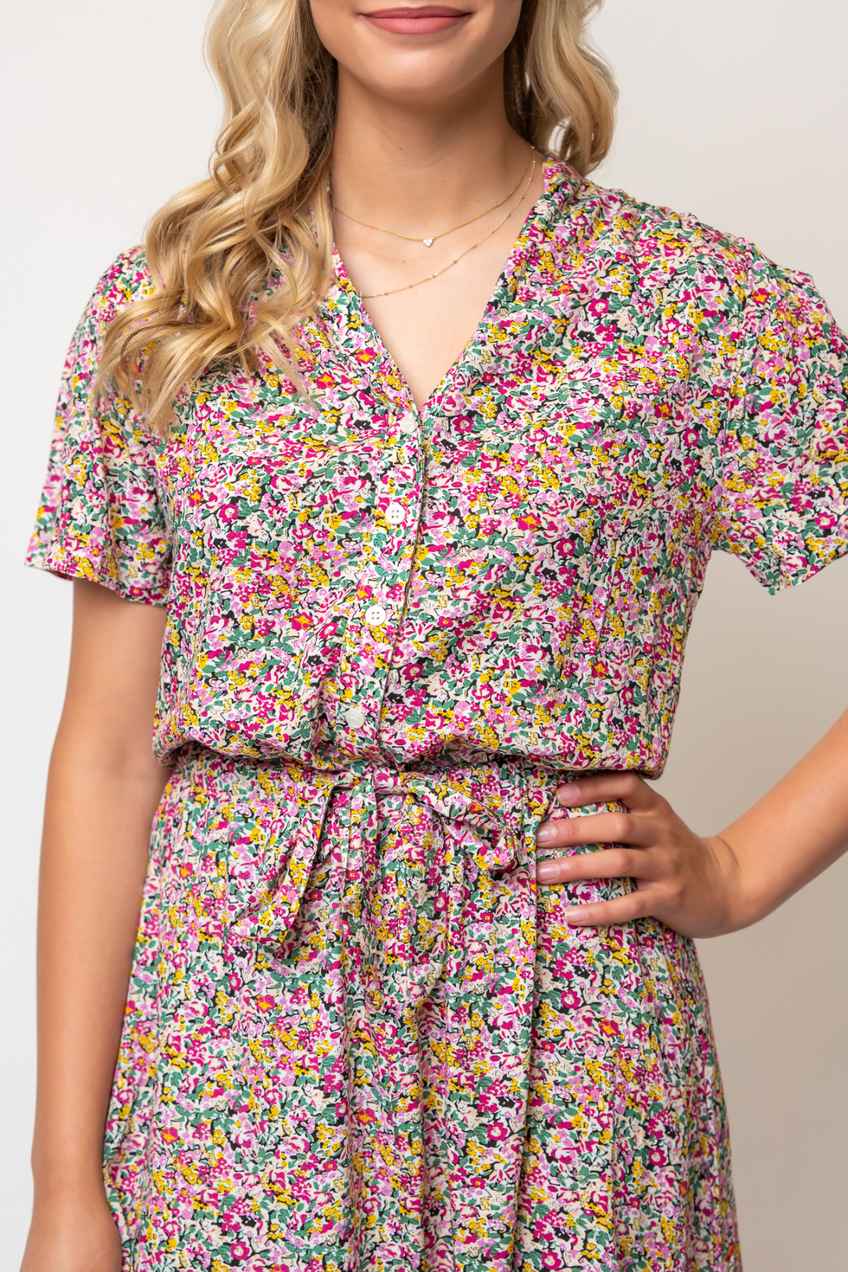 Zelie Shirt Dress in Black & Salmon Ditsy Floral