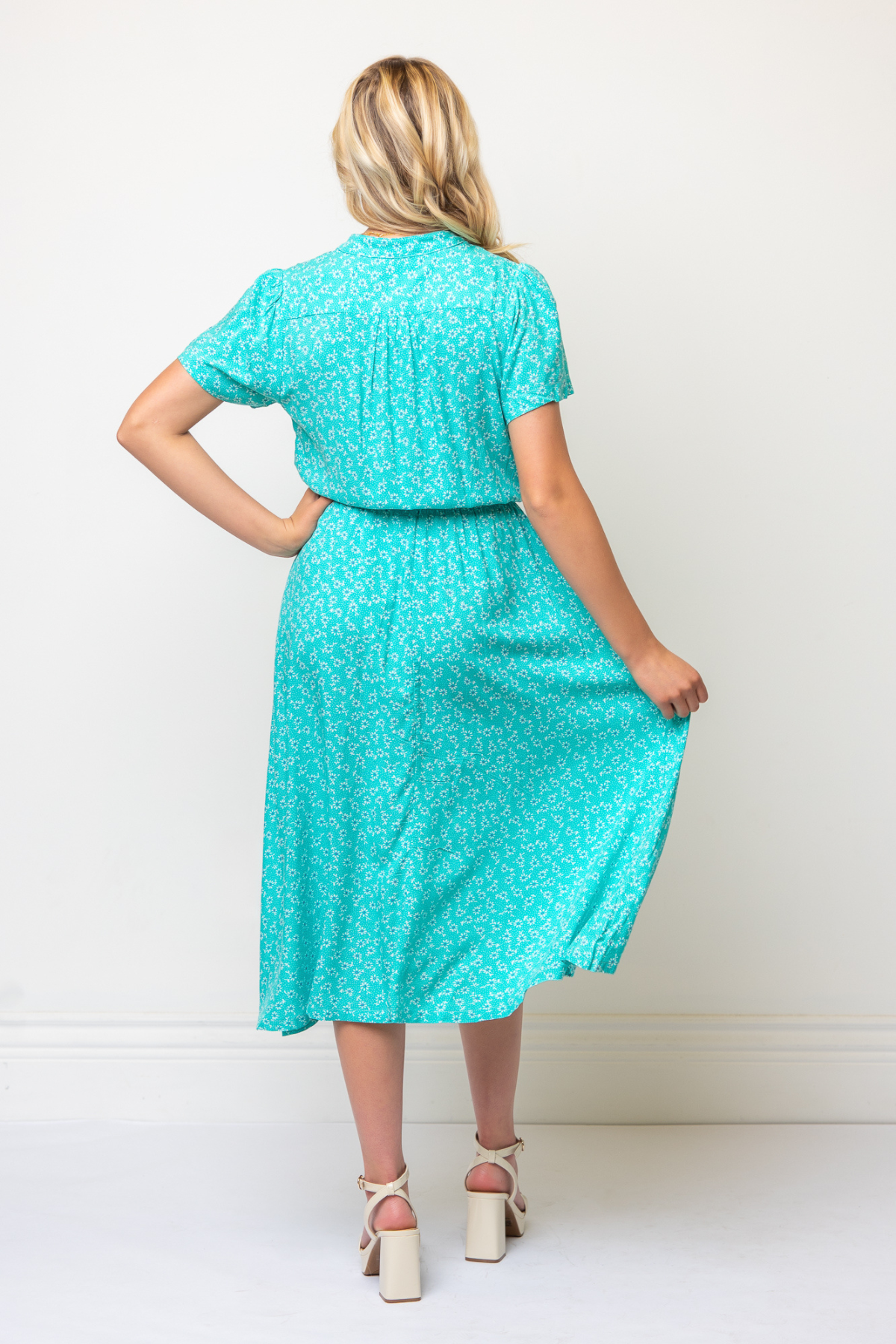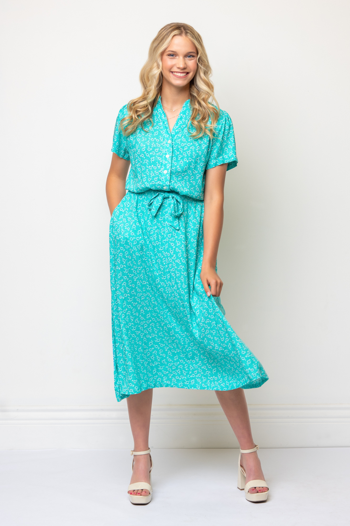 Designed for both comfort and style, the relaxed button-front bodice allows for easy movement and a cool, summery fit. The functional drawstring tie provides a fitted waist and a flared skirt, creating a flattering silhouette. Classic loose-fit short sleeves complete the look, perfect for any occasion.